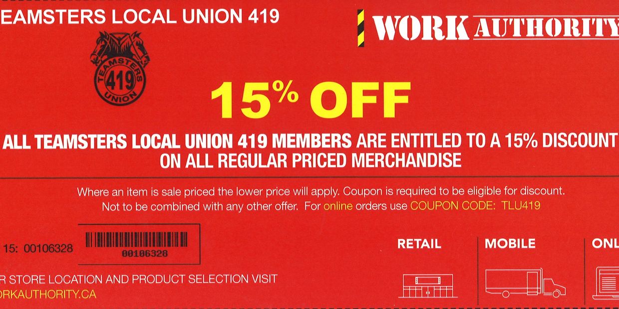 All Teamsters Local Union 419 members are entitled to a 15% discount on all regular priced merchandise. For online orders use coupon code: TLU419